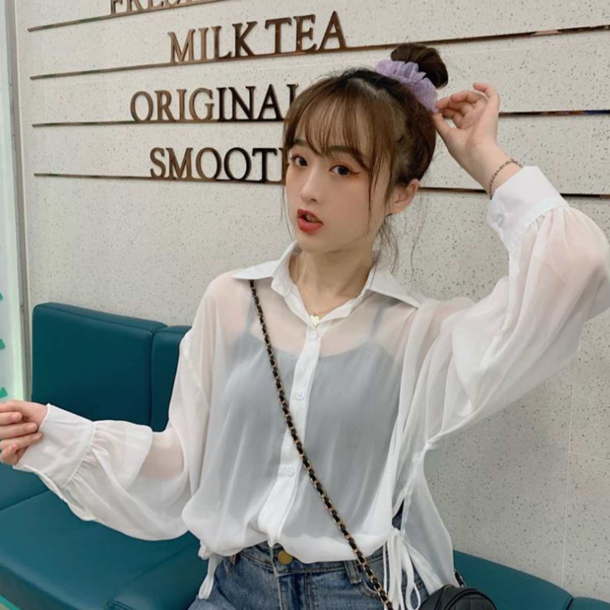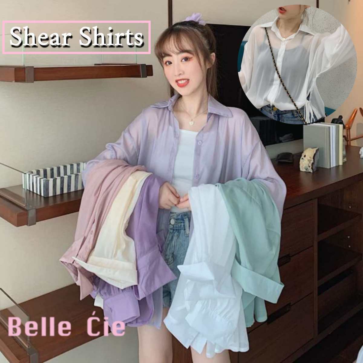 ふんわり透け感のあるシアー素材が女性らしさを引き立てる、トレンドの韓国風ガーリートップス。